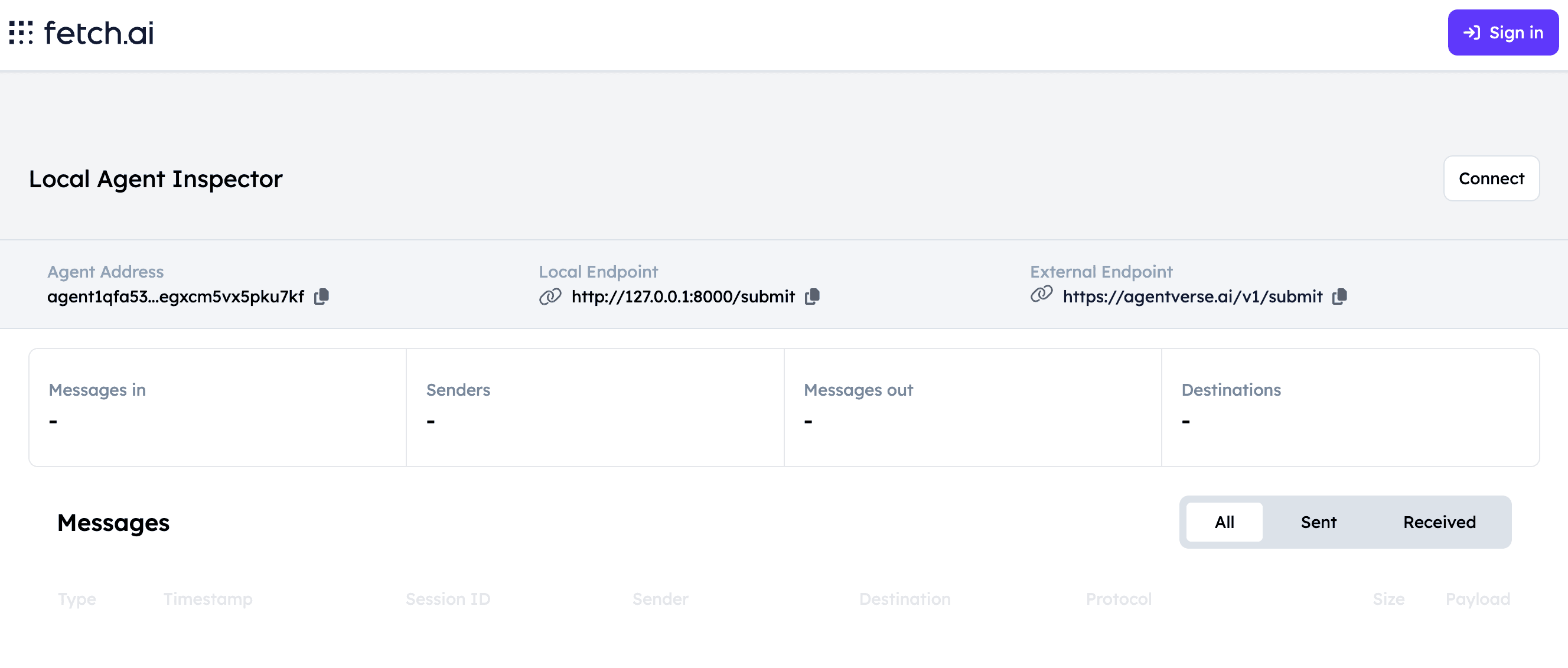 Here you can view all the information about your local Agent, including details about all messaged sent and received by the Agent. Additionally, you can connect you local Agent directly via the Inspector UI, by clicking the Connect button and following the steps required. For a better representation of the process, have a look at the following guide here.