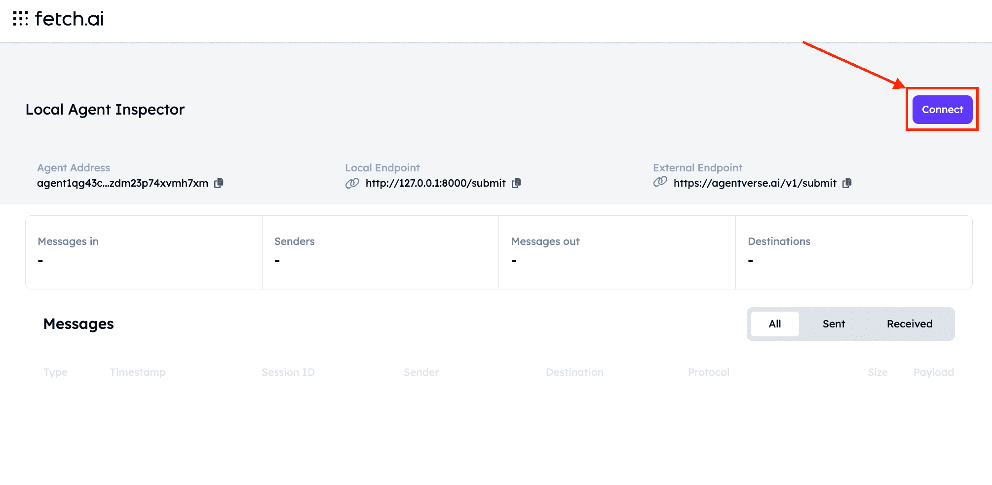 Now that we defined our uAgent and have successfully run it, we can go on and connect it to the Agentverse via a Mailbox. To do so, make sure your uAgent is running. Then, click on the Local Agent Inspector