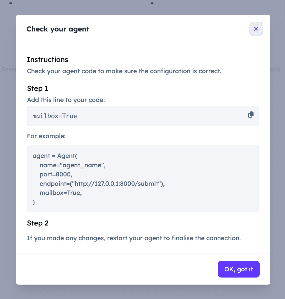 agent.run()Importantly, you need to provide the SEED_PHRASE, name, seed and port parameters to correctly run this example. You also need to set mailbox=True to correctly connect your Agent to the Agentverse through the Mailbox.