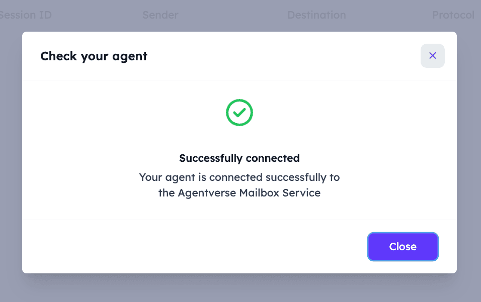 INFO: [mailbox]: Successfully registered as mailbox agent in AgentverseYou can view your recently connected local Agent by heading to the Agentverse My Agents tab. Your Agent will be assigned a Mailbox tag.