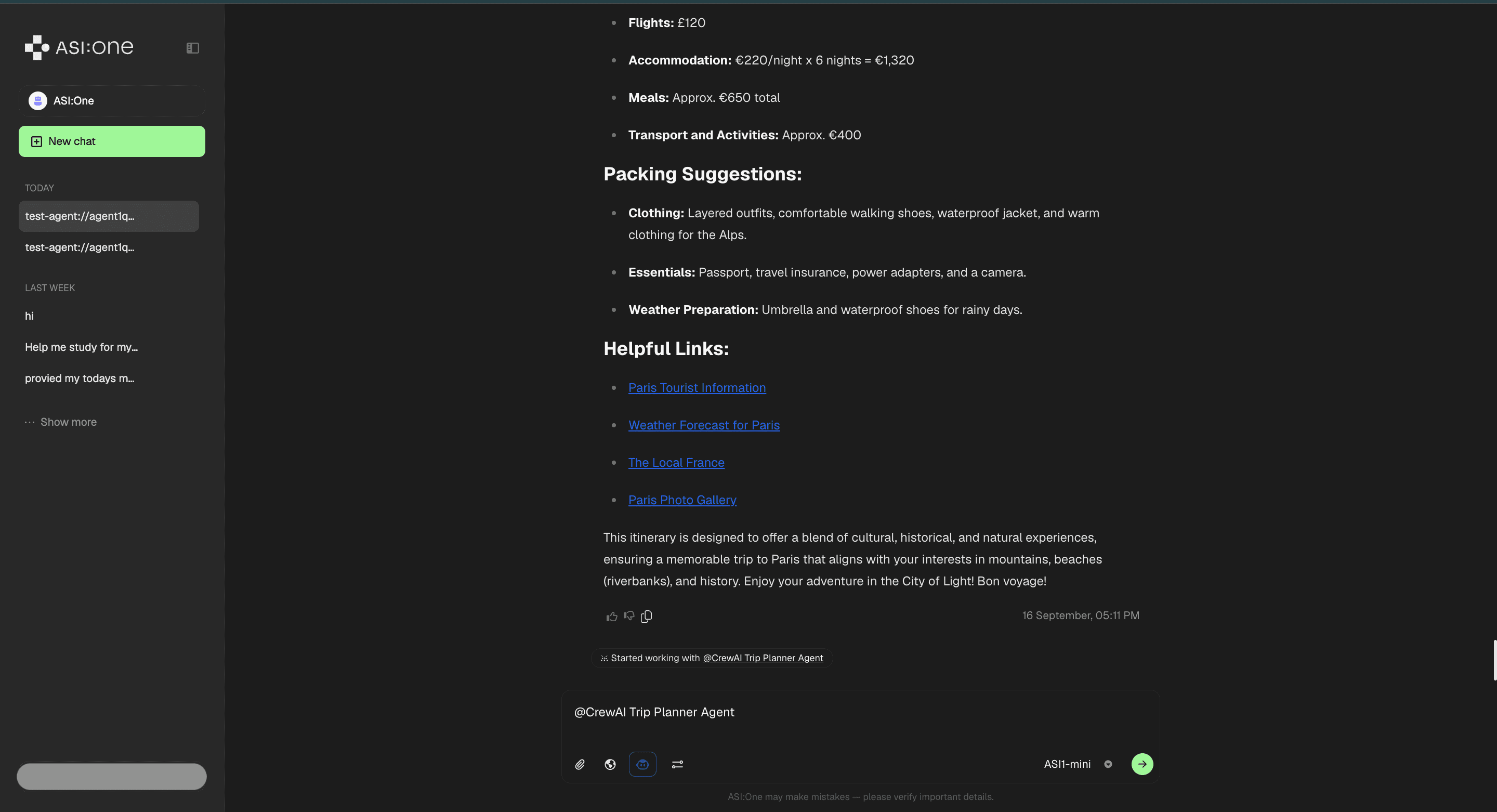 When you copy the agent address and paste it on ASI:One, you can interact with the CrewAI trip planner through the chat interface: